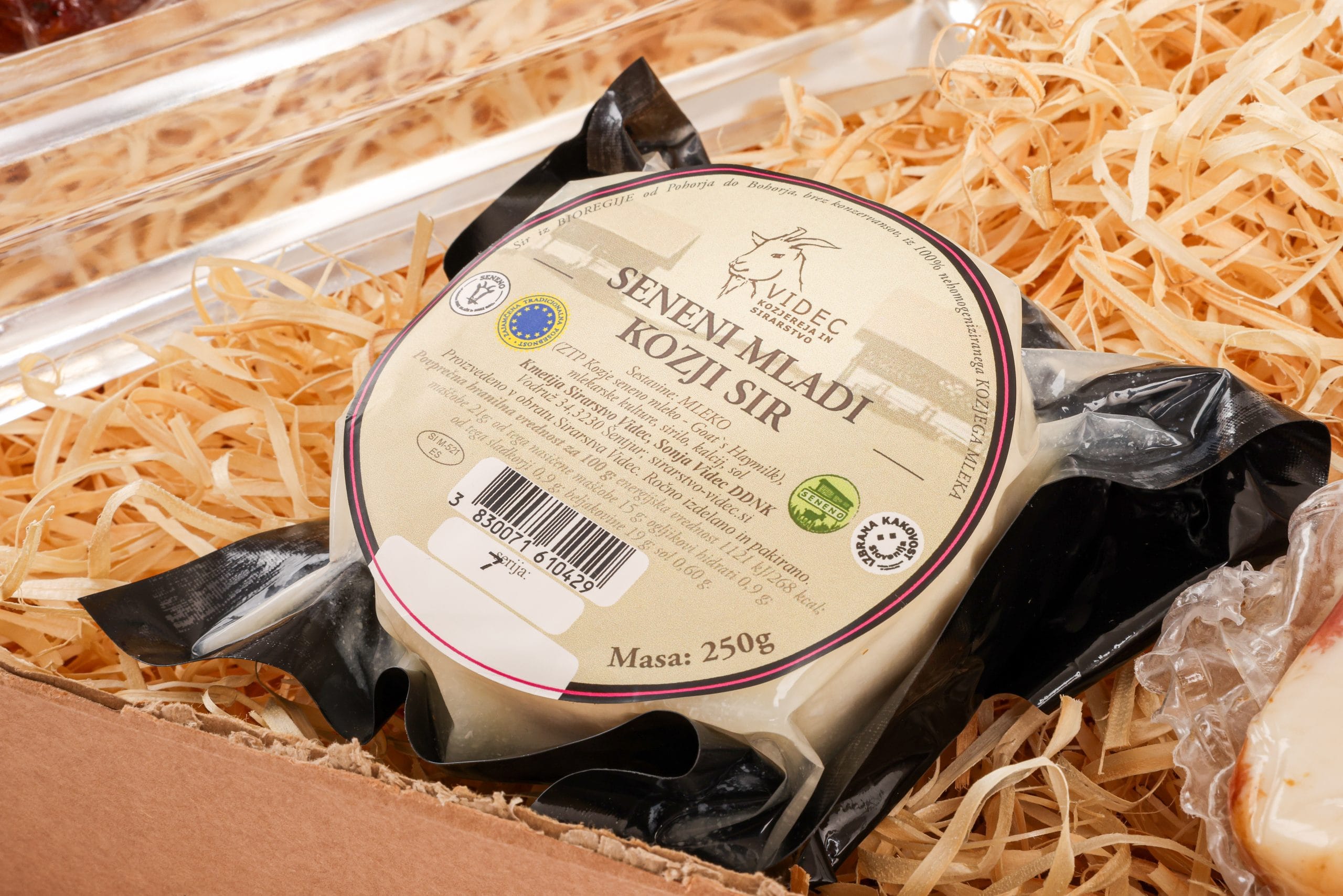 Seneni mladi kozji sir, 250 gr – Sirarstvo Videc – Nekoliko po zorjeni Seneni mladi kozji sir je novi izdelek Kmetije Sirarstva Videc. Je prijetno nežnega okusa, v njem se harmonično prepleta raznolik spekter okusov, ki pride bolj do izraza, v primeru da sir pred uporabo nekoliko pustite na sobni temperaturi.Struktura sira je gosta in dovolj kompaktna, da ga lahko uporabljate za razne narezke, kot tudi solate. Ponudite ga zraven sadja in oreščkov, je preprosto odličen ob kozarčku vina in vaši domišliji prepuščenim dodatkom
